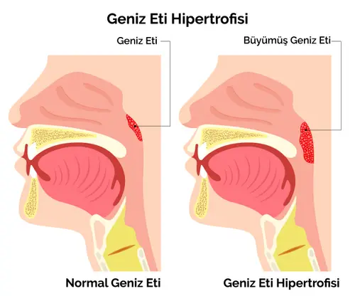 Geniz eti yapısal bozukluklara sebep olabilir ve bu hastalar kapıdan girdiğinde direk yüzünden tanınabilir. Anne babasına benzemek yerine Adenoid yüz dediğimiz kendilerine has tipik yüz belirtisi gösterir. Problemin uzun sürmesi sonucu uzun ve ince yüz yapısı, yüksek damak, üst çenenin öne doğru büyümesi, ağzının sürekli açık olması hali, bozuk dişler ve gözaltlarında çöküklükle karakterize tipik yüz ifadesi ortaya çıkar.